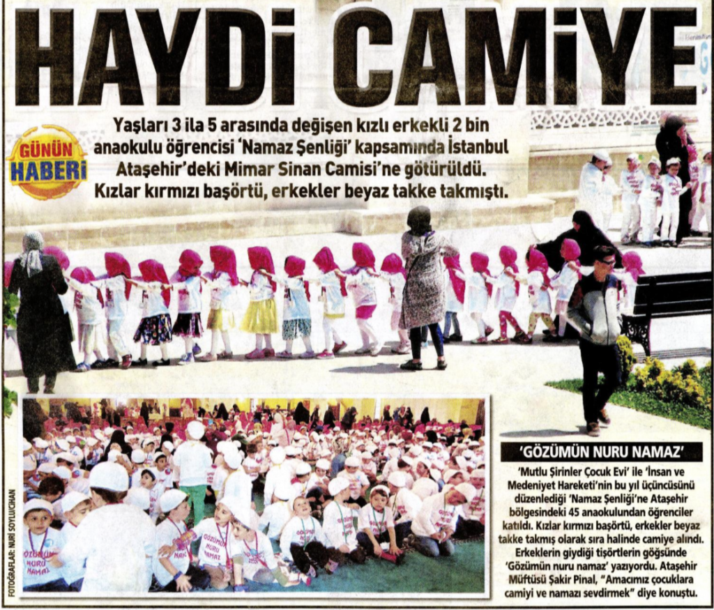 Aydın Doğan medyası 28 Şubat darbesinden iyi bildiğimiz refleksini her seferinde açığa çıkarmaktan geri durmuyor. Bu kez de Posta gazetesinin bugünkü manşeti. “Haydi camiye” başlıklı haberle, anaokulu çocuklarının “Namaz Şenliği” projesi kapsamında camiye götürülmesinden rahatsız oldu. 28 Şubat darbesi manşetlerini hatırlatan haberle kız çocuklarının camiye girerken başörtüsü takmasına, erkek çocukların da beyaz takkeli olmasına vurgu yapıldı. Namaz kılmak ve camiye gitmeyi, bunu da çocuklara özendirmeyi bir “gericilik” ve “yobazlık” olarak sunup toplumu sanki kötü birşeymiş gibi kışkırtmayı hedefleyen haber de gösterdi ki, Aydın Doğan’a 28 Şubat’ın hesabı sorulmadığından oluyor bunlar…
