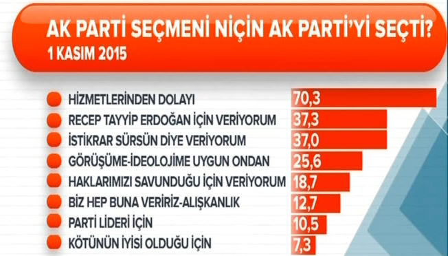 Adil Gür’ün seçmene yapmış olduğu ankette yer alan, “Neden AK Parti’yi seçtiniz?” sorusuna verilen cevap sayısı birden fazla. Seçmenin yüzde 70,3’lük kısmı “Hizmetlerinden dolayı” cevabını veriyor. AK Parti’nin hizmetleri meselesini bugünkü Cumhurbaşkanı Recep Tayyip Erdoğan’la ilişkilendirmek mümkün, çünkü AK Parti’nin 13 yıllık iktidarında Recep Tayyip Erdoğan başbakanlık yapıyordu. Başbakanlık yaptığı dönemlerde halka sunduğu hizmetler halkın hem kalbini hem de güvenini kazandı. Seçmen Cumhurbaşkanı Erdoğan’ın başbakanlık dönemindeki hizmetlerinden gayet memnun. Cumhurbaşkanı Erdoğan’ın başbakanlığı süresinde yapmış olduğu hizmetlerin seçmenin üzerinde oluşturduğu güven hissi ise hala seçmende mevcut. Elde edilen bu veriler ise, 7 Haziran seçimlerinde Cumhurbaşkanı Erdoğan’ın sahaya inmesiyle AK Parti’nin oy kaybettiği söylemlerinin doğru olmadığını gösteriyor.
