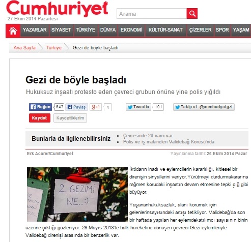 Taraf ve Cumhuriyet gazetesi tarafından yapılan haberde, Türkiye’nin savaş alanına döndüğü Gezi kalkışmasının da ‘çevrecilik’ adı altında başladığı belirtilerek “Yaşanan hukuksuzluk, alanı korumak için gelenlerin sayısındaki artışı tetikliyor. Validebağ’da son bir haftada yapılan her eylemde katılımcı sayısının binin üzerine çıktığı gözleniyor. 28 Mayıs 2013’te halk hareketine dönüşen çevreci Gezi eylemleriyle Validebağ direnişi arasında bir benzerlik var” ifadeleriyle Gezi ve Validebağ korusu eylemleri arasındaki ortak amaç ortaya konuldu.