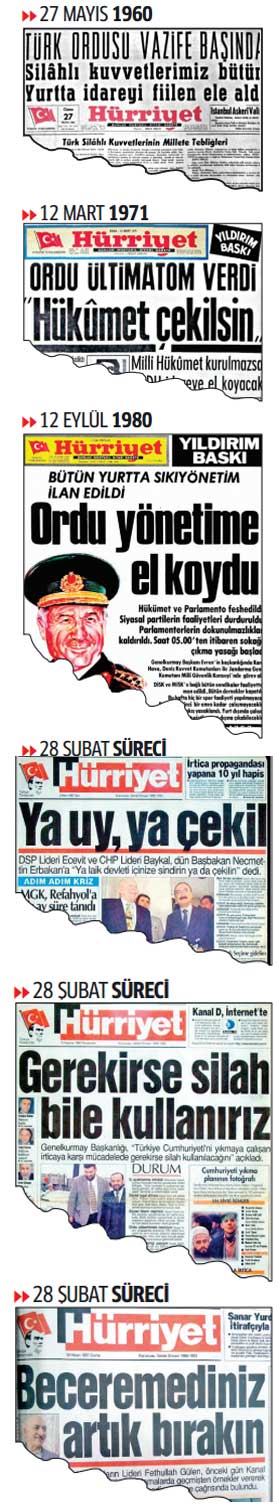 Refah-Yol hükümetini düşüren vesayetin asker, yargı, sermaye, üniversiteler ve medyadan oluşan oyuncularının tamamı değişse de attığı manşetlerle ‘Darbenin şartlarını olgunlaştıran’ Hürriyet, bugün de vesayetin medya kolunun ayakta kalan son kalesi olarak varlığını sürdürüyor. Hürriyet bunu, darbenin 20. yılında attağı ‘Karargah rahatsız’ manşetiyle bir kez daha gözler önüne serdi. 28 Şubat 1997’de askerlerin yoğunlukta olduğu Milli Güvenlik Kurulu’nda (MGK) gündem ‘irtica’ idi. Ülkede PKK terörü her gün can alırken, ‘irtica’ bir numaralı tehdit olarak gündeme taşındı. Askeri vesayet, hem yürütmeyi hem de yasamayı devre dışı bıraktı. Genelkurmay içinde oluşturulan ‘Batı Çalışma Grubu’ kamu görevlilileri, öğretmen, öğrenci, esnaf, işadamı herkesi fişledi. Türkiye, bir generalin ülkenin başbakanına kamuoyu önünde küfür ettiği utancına tanıklık etti. Bir başka general, ‘Kudüs günü’ kutlanan Ankara Sincan’da tankları yürüterek ‘darbe’ tehdidinde bulundu. Tankların neden yürütüldüğünü ‘Demokrasiye balans ayarı yaptık’ diyerek darbeyi de itiraf etti. Sonunda milletin seçtiği hükümet düşürülerek, yerine askerlerin atadığı Mesut Yılmaz hükümeti getirildi. Darbecilerin kurdurduğu hükümetin ilk icraatları arasında Kur’an Kursları’nın ve İmam Hatiplerin orta bölümünün kapatılması, rantiyenin hortumlarını kesen havuz sisteminin kaldırılması gibi uygulamalar yer aldı.