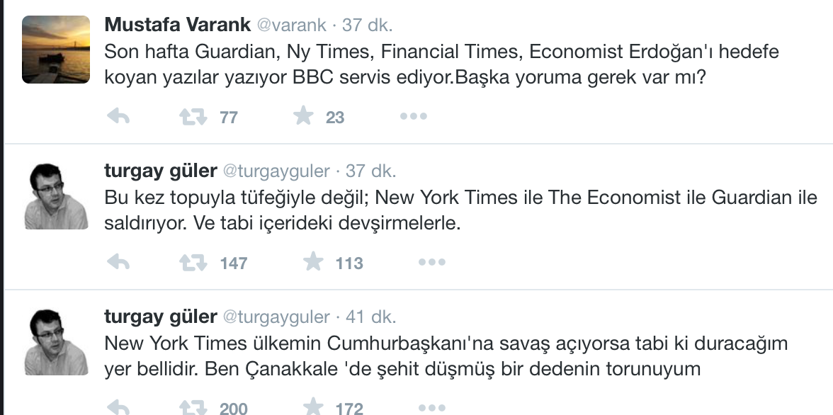 Geçtiğimiz günlerde Erdoğan’ın kişiliğine hakaret eden Guardian ise “Eğer Erdoğan pazar günü istediğini alırsa, durdurulamaz olacak. Eğer engellenirse kin dolu gazabı tehlikeli bir şekilde serbest olmuş olacak” ifadelerini kullanarak haddini aştı.