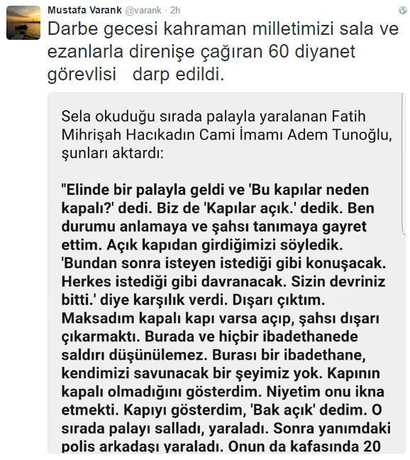 “Bunu yaparsak FETÖ benzeri sahte örgütlenmelere hiçbir şekilde meydanı boş bırakmayacağız. Bunları söylerken karamsar bir tablo ortaya koyuyorum zannetmeyin. Eğer camilerimizi bu hale getirirsek inanın ki Türkiye toplumunun sorunlarının çoğunu çözmüşüz demektir. 15 Temmuz günü o karanlık gecede, ertesi sabahın ne olacağı belli değil, uçakların Ankara ve İstanbul semalarında alçaktan uçtuğu, ben Başbakanlık binasındaydım ve neredeyse binayı yıkarcasına üstümüzden geçtiği, helikopterler ile ateş açıldığı, tanklar ile halkın üstüne yüründüğü, insanların tanklar ile biçildiği, makineli tüfekler ile tarandığı bir ortamda, sabaha çıkıp çıkmayacağımızın belli olmadığı bir ortamda bu toplum genlerinde olanı ortaya koydu. Camiler bir darbeyi önleyecek mücadele merkezi haline gelebiliyormuş. Bütün bu camilerden sela okuyan kardeşlerimizden Allah razı olsun. Sela seslerinden rahatsızlık duyan o sütü bozuklar, kanı bozuklar, o hainler, bu coğrafyanın tarih boyunca görmediği en büyük ihaneti ortaya koyan ihanet şebekesi mensupları, 60 müezzin ve imam arkadaşımızı sela okuyor diye darp ettiler ve gazi ettiler. Bir ruhu, diriliş ve iman ruhunu bu topluma minarelerden dalga dalga yaydınız ve 15 Temmuz’un görünmez kahramanlarından oldunuz. 15 Temmuz akşamı camiler, bir kez daha toplumun merkezi olduğunu ilan etti.”