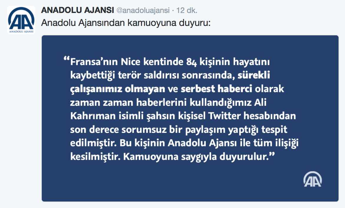 Twitter hesabından kendisini AA muhabiri olarak tanıtan Ali Kahrıman Fransa’daki Nice saldırısından sonra kişisel Twitter hesabından yaptığı paylaşım tepki çekmişti. Anadolu Ajansı kamuoyuna o isimle yolların ayrıldığını duyurdu.