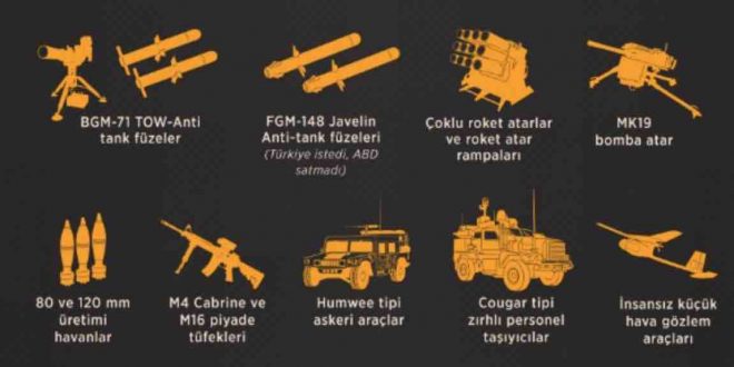 AA muhabirinin, Suriye’de çatışan PYD/PKK’lıların sahada çekerek sosyal medya hesaplarında paylaştığı görsellerden yaptığı incelemeye göre, örgütün elinde TOW füzelerinin yanı sıra ABD menşeli şu silah ve askeri araç gereçler var: