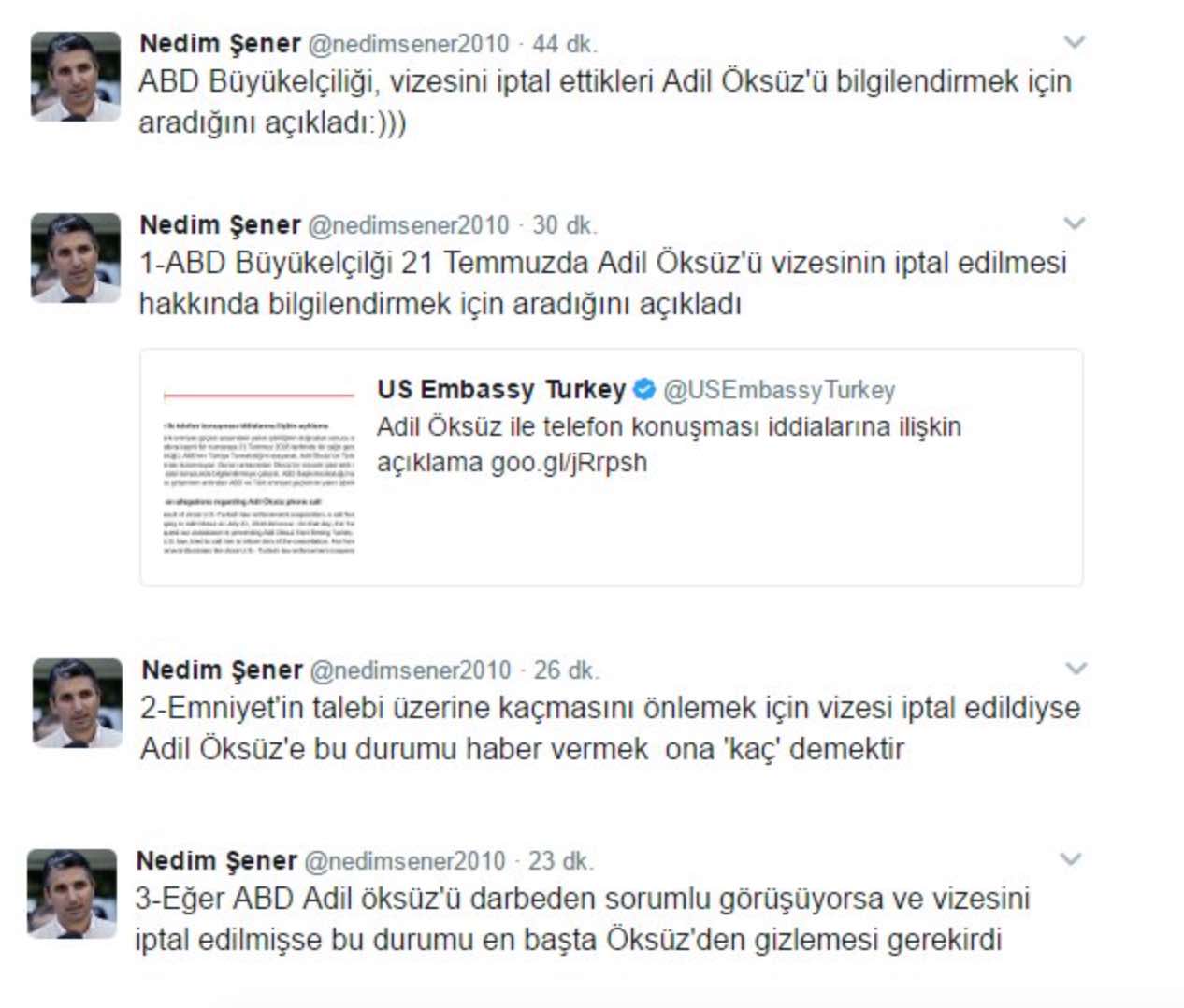 ABD Büyükelçiliği’nin bu açıklamasını değerlendiren gazeteci Nedim Şener, “Adil Öksüz’e bu durumu haber vermek ona ‘kaç’ demektir.” ifadelerini kullandı.