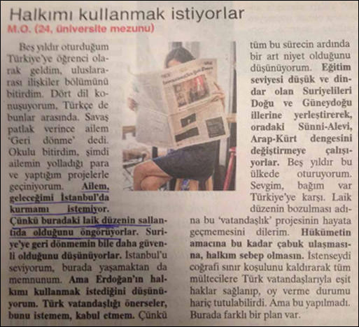 Gerçekleştirdiği düzmece röportajla kendi lehine bir algı yaratmaya çalışan Doğan Grubu, hem Türkiye kamuoyunda hem Suriyeli sığınmacılar nezdinde “vatandaşlık” verilme düşüncesini bir provokasyona dönüştürme çabası içine girdi. Suriyeli sığınmacılara Türkiye vatandaşlığı verilmesini “AK Parti’nin art niyetli” politikası şeklinde servis etmeye çalışan Hürriyet, Suriyeli olduğunu iddia ettiği kimliğini gizleyip ve fotoğrafını buzladığı bir kişinin manşetine taşıdığı açıklamalarında, Suriyelilere vatandaşlık verilmesinin oy kaygısıyla yapıldığı, sığınmacıların vatandaşlık vaadiyle kandırıldığı, onların oy deposu olarak düşünüldüğü, Türkiyenin derdinin onların yaşam şartlarının iyileştirilmesi olmadığı gibi tamamen art niyetli ve çarpıtılmış ifadelere yer verdi.