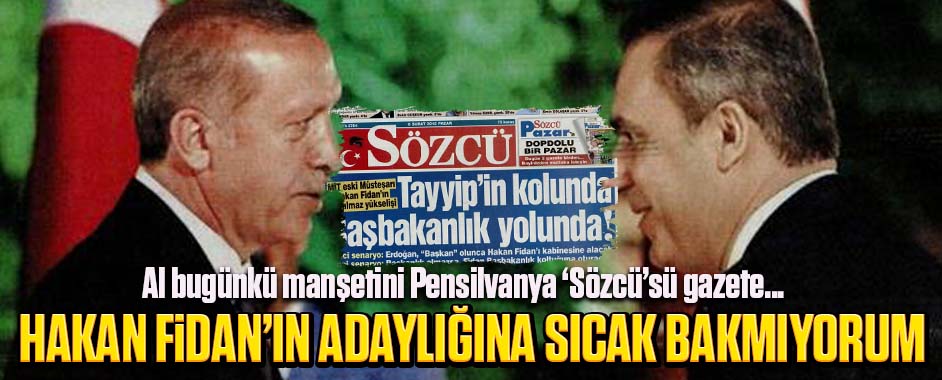 Cumhurbaşkanı Erdoğan Latin Amerika ziyareti öncesi Atatürk Havalimanı’nda yaptığı açıklamayla MİT Müsteşarı Hakan Fidan’ın milletvekili adaylığına sıcak bakmadığını ifade etti. Ezber bozan açıklamasıyla paralel terör örgütünün “Fidan’ın adaylığı bir Erdoğan projesi” propagandası da boşa çıktı. Aynı algı operasyonunu bugünkü manşetiyle sürdüren Pensilvanya “Sözcü”sü de bir kez daha “paralel tetikçi” olduğunu açık etti.