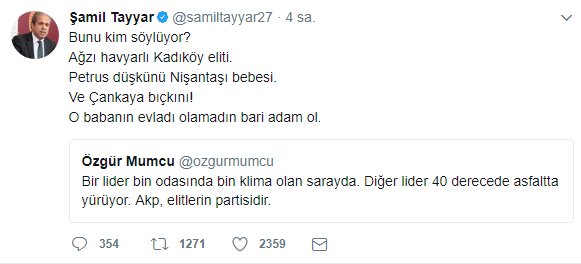 Gereken cevabı AK Parti Gaziantep Millietvekili Şamil Tayyar verdi. Tayyar, “Bunu kim söylüyor? Ağzı havyarlı Kadıköy eliti, Petrus düşkünü Nişantaşı bebesi ve Çankaya bıçkını. O babanın evladı olamadın bari adam ol.” dedi.