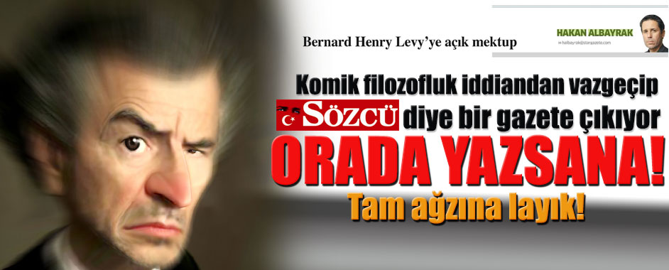 MEDYAGUNDEM.COM- Star gazetesi yazarı Hakan Albayrak bugün “Bernard Henry Levy’ye açık mektup” başlıklı yazısında Cumhuriyet gazetesine röportaj verip, Mısır’daki askeri darbenin arkasında İsrail’in olduğunu söyleyen Başbakan Erdoğan için “…sayıklıyor. Fransa’da aklını kaybettiği ve saçmaladığı konuşuluyor. Fransa’da ve ABD’de herkes ona gülüyor artık” diyen Yahudi entele “Türkiye’de Sözcü diye bir gazete çıkıyor. Tam ağzınıza layık. Komik filozofluk iddianızdan vazgeçip orada yazsanıza.” tavsiyesinde bulundu.