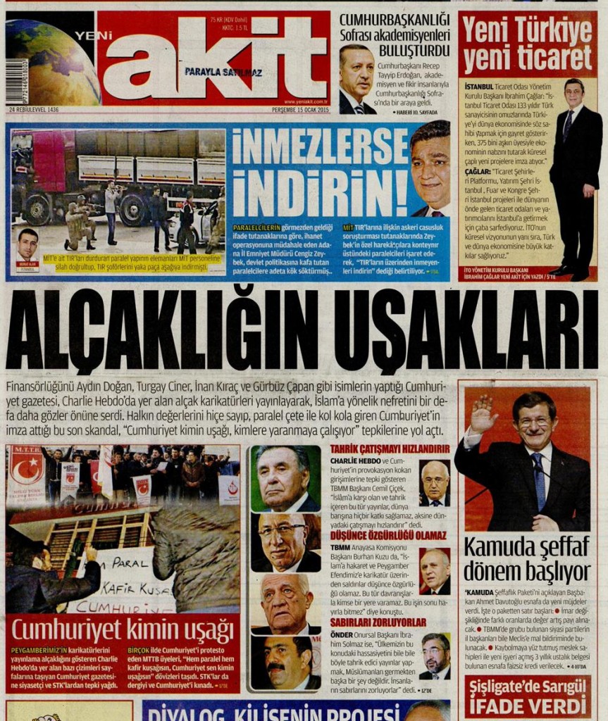 Hükümete yönelik 17 – 25 Aralık kirli operasyonlar sonrası Paralel Yapı’nın sözcülüğünü üstlenen Cumhuriyet gazetesi, yine bir skandala imza attı. Dini değerleri aşağılayan Fransız dergisine yönelik saldırıyı bahane eden Cumhuriyet gazetesi adeta içindeki nefreti kustu. Gazete, Charlie Hebdo dergisinin Türkçe çevirisini, dört sayfalık özel sayı ile sayfalarına taşıdı.