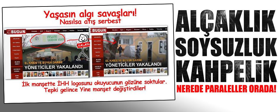 Paralel devlet örgütünün İHH’ya yönelik yaptığı algı operasyonun medya ayağı da boş durmuyor. Bugün gazetesinin internet sitesi bugun.com.tr ”El Kaide’ye büyük darbe” manşetini atıp, İHH fotoğrafı kullandı.