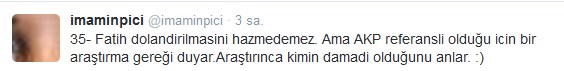 9. böyle saçma bir hikaye görmedim.madem elinde belgeler var koysaydın ya twitter e salak herif ayrıca bu zamana kadar çıkmamışta böyle bişey şimdi bu zamanda çıkmasının zamanlamsı manidardır.bence bu misilleme ile yapılmış bir iftira olduğunu sanıyorum.daha önceki iftiralar gibi 3-5 gün sonra ispatı olmayınca buda unutulur gerisi gelmez çünkü bu dönem birilkerinin birilerini sıkıştırmya çalıştığı bir dönem ispatı olmayan hiçbirşey bana safsata gelir.:)
