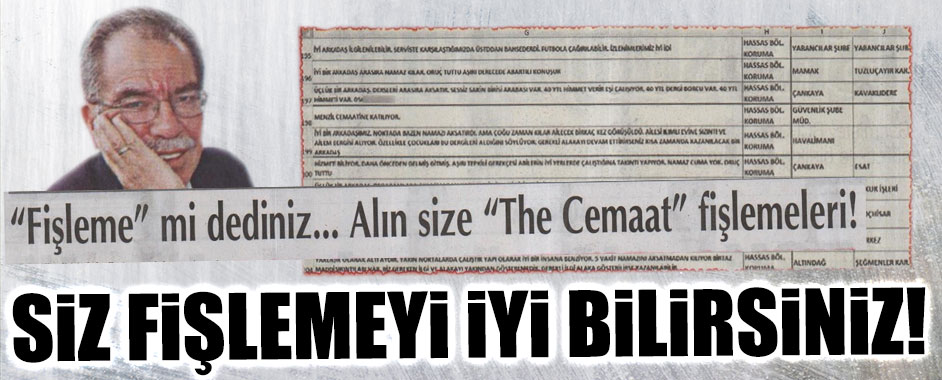 “28 Şubat cuntacıları”nın yaptığı “fişleme”lerden, “insan”ları ve “kebapçı”ları bile “kara liste”ye almalarından bıkmış, usanmıştık… Şimdi görüyoruz ki; Taraf vasıtasıyla “fişlemeleri deşifre” eden ve Hocaefendi’nin; “kolum-kanadım kırıldı” diyerek şikâyet ettiği “fişlemeler”in aynısını “The Cemaat” yapıyor!..