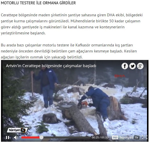 Eti Bakır A.Ş.’den yapılan açıklamada “Artvin Cerattepe’deki eylemlerle ilgili bazı mecralarda Doğan Haber Ajansı’na dayanılarak “Cerattepe’de ağaç kıyımı başladı” başlıklı haberler yer almaktadır. Eti Bakır tarafından Cerattepe bölgesinde ağaç kesimi yapılmamaktadır. Doğan Haber Ajansı’nın haberinde “Fırtınadan yıkılan ağaçlar çalışanların ısınması için odun haline getiriliyor” ifadesi yer almasına rağmen kamuoyunu yanıltıcı ifadelere yer verilmektedir. Haberde de anlatıldığı gibi ağaçlar fırtınada yıkılmıştır. Çalışanlarımız yıkılan ağaçları, güvenlik ile işçilerin üşümemesi ve çevrenin temiz olması için odun haline getirmiştir. Kamuoyunun bilgisine sunarız” denildi.