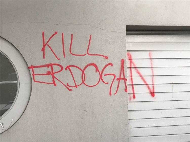 Grup, Cumhurbaşkanı Recep Tayyip Erdoğan aleyhine slogan attı. Bina çevresinde Erdoğan’a ölüm (Kill Erdogan) yazılarının yazıldığı görüldü.