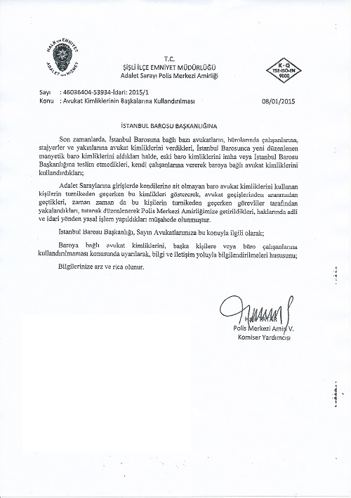 Yazının devamında, İstanbul Barosu’nun, kimliklerini başka kişilere kullandırılmaması konusunda avukatlara uyarıda bulunması istendi.
