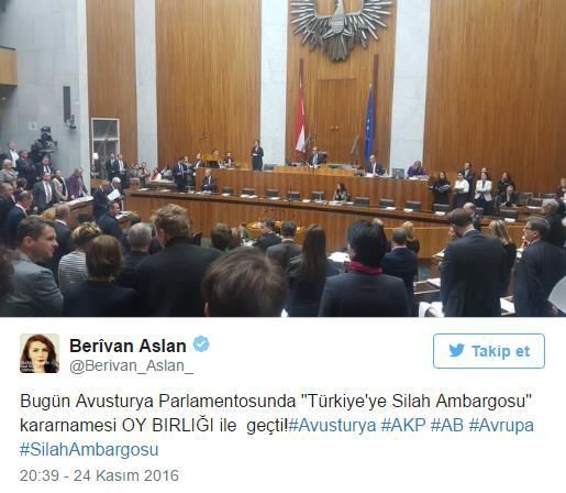 Fetullahçı Terör Örgütü’nün 15 Temmuz darbe girişimine ses çıkarmayan, terör örgütü PKK’ya da göz yuman Avusturya, Türkiye’ye silah ambargosu uygulanması yönünde karar aldı.