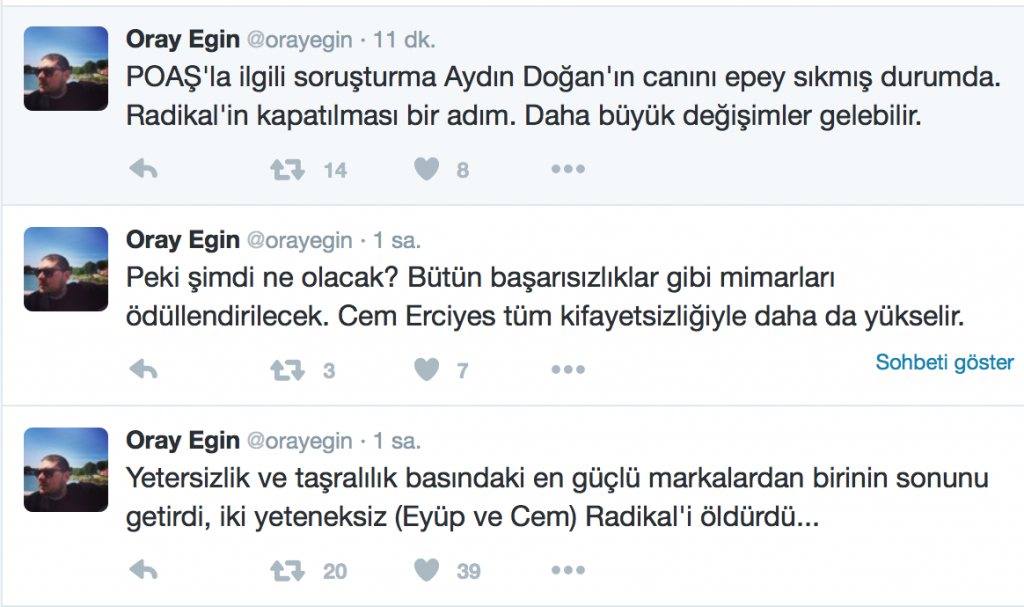ABD’de yaşayıp, Sözcü’de haftada bir yazan Oray Eğin, Hürriyet’te Ertuğrul Özkök’ün büyük kankasıdır. Özkök Doğan grubundaki her kulisi onunla paylaşır. Oray Eğin’in şu tweetleri Aydın Doğan’ın POAŞ davasıyla nasıl sarsıldığını içeriden sızdırılmış bilgilerle göstermektedir.