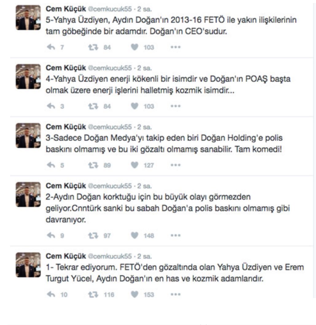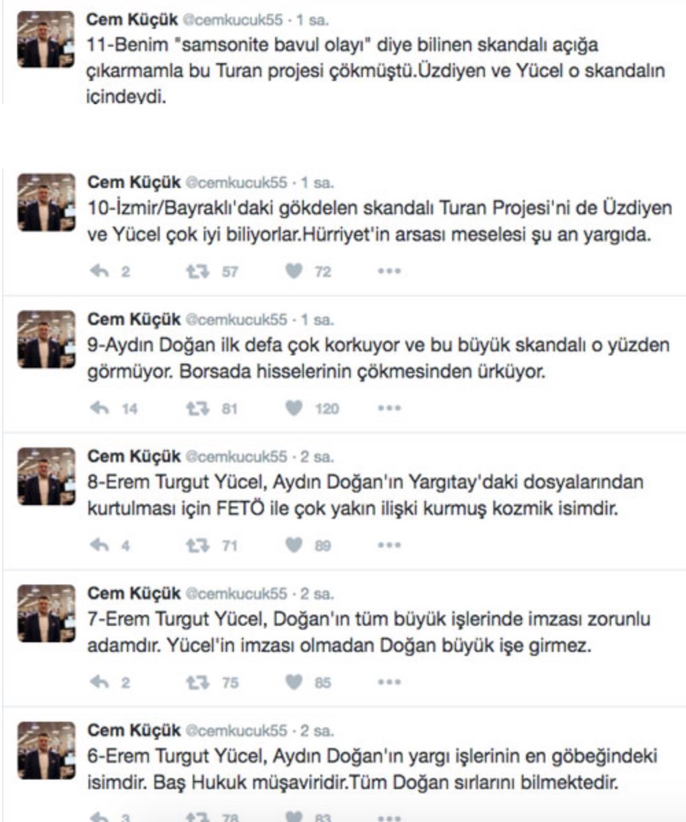 Doğan Holding’e yapılan polis baskının ardından iki isim gözaltına alındı. Cem Küçük, Yahya Üzdiyen ve Erem Turgut Yücel’le ilgili çarpıcı iddialarda bulundu.