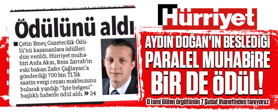 Arda Akın’ın gazeteci olmadığını, paralel örgütün üyesi olduğunu buradan bile anlayabiliriz. 7 Şubat gibi bir ihanet davasını Hürriyet’te duyuran Arda Akın, Rıza Zarrab’ın eski bakan Zafer Çağlayan’a gönderdiği iddia edilen 700 bin TL’lik saatin vergi cezası makbuzunu bularak yazdığı “İşte belgesi” başlıklı haberiyle Çetin Emeç Gazetecilik Ödülü’ne layık görülmüş biri.