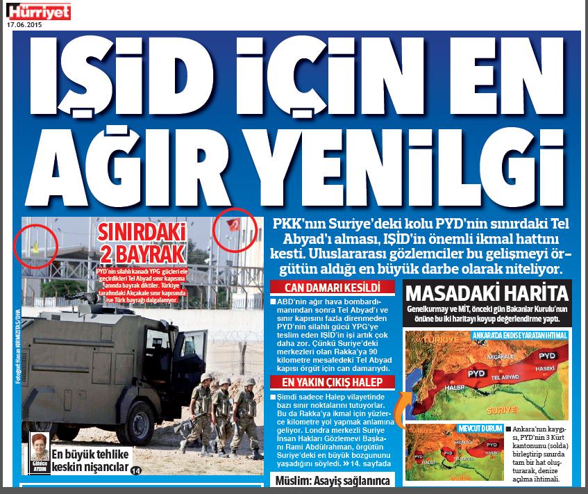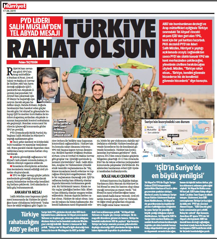 7 Haziran seçimlerinde HDP’ye çalışan Doğan medyasının şimdi de PKK’nın Suriye’deki uzantısı PYD’yi aklamaya çalışması kafaları karıştırdı. Kamuoyu PYD’nin Araplar ve Türkmenleri bölgeden uzaklaştırmaya çalışmasını konuşurken Hürriyet’in PYD’yi manşetten sempatik gösterme çabası “acaba bir pazarlık mı var?” sorusunu akıllara getirdi.