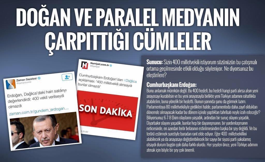 Doğan Medya ve Paralel Yapı medyası Cumhurbaşkanı Erdoğan’ın canlı yayında ‘Dağlıca saldırısı’na ilişkin açıklamasıyla “400 milletvekili’ açıklamasını çarpıttı.