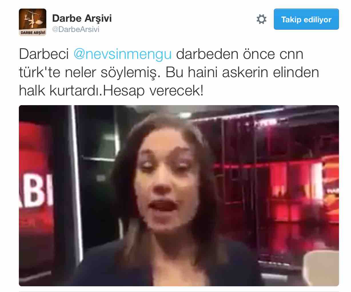 CNN Türk’te Ana Haber sunucusu olan Nevşin Mengü darbe girişiminden dakikalar önce CNN kameralarında hem devlete hakaret etti hem de darbe girişiminde bulunun cuntacı askerleri övdü.