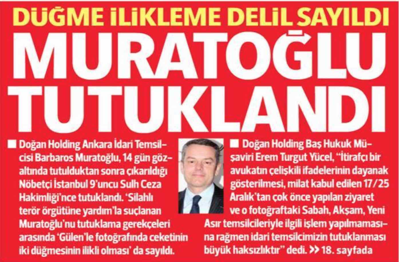 Hürriyet’in bugün birinci sayfasında yer alan haberde, “Düğme ilikleme delil sayıldı” denilirken, Muratoğlu’nun FETÖ ile bağlantısı inkar edilip sahip çıkıldı.