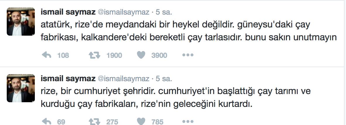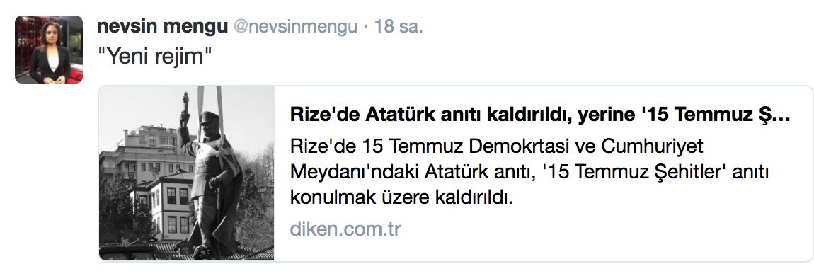 Doğan medyası, Sözcü gazetesi, Odatv, sol kemalistler ve Doğan grubunun tetikçileri…. 15 Temmuz Demokrasi ve Cumhuriyet Meydanı’ndaki Atatürk heykelinin tamamen kaldırıldığını yazılarak provokasyona imza attılar. Ancak Rize Belediyesi bir açıklama yayınlayarak, heykelin Cumhuriyet Meydanı’ndan alınıp Rize Valiliği önündeki tören alanına götürüldüğünü kamuoyuna duyurdu. Türkiye’nin geçtiği bu kritik günlerde milli birlik ve beraberliğe darbe vurmak isteyen hainlerin oyunları bir bir deşifre oluyor. Doğan beslemesi iki provokatör İsmail Saymaz ve Nevşin Mengü… Dün attıkları tweetlerle bir yalan üzerinden toplumu kışkırttılar. İsmail Saymaz ve Nevşin Mengü… Sabah solcu kalkıp, öğlen FETÖ’cü, öğleden sonra kemalist, akşam ateist olan operasyon tipleri…