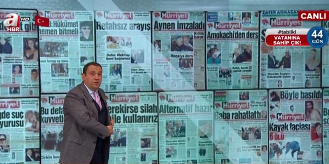 Doğan Medya’nın patronu Aydın Doğan’a söz konusu manşetler için tepki gösteren Erkan Tan manşetleri tek tek gösterdikten sonra, “Aydın Doğan yapma… Kimin hesabına çalışıyorsun… Aydın Doğan, karargahımıza saldırıyor…” diye konuştu.