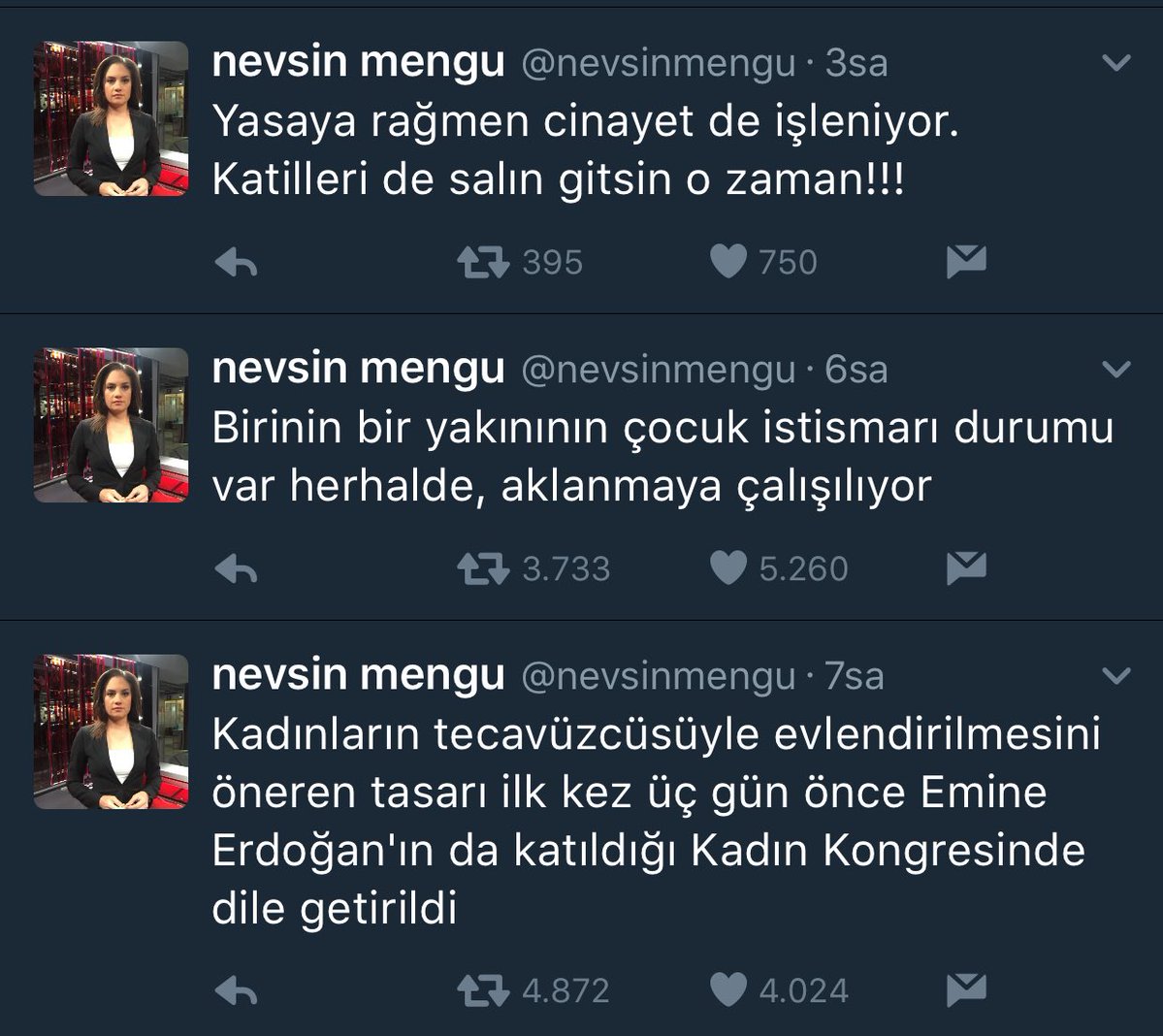 CHP’nin başını çektiği provokasyon ekibi, “AK Parti tecavüzü serbest bırakıyor” yalanıyla bir algı oluşturmaya çalışırken, Aydın Doğan medyası tam da istediği kışkırtma ortamına odun atıyor. Adalet Bakanı Bekir Bozdağ da , Başbakan Binali Yıldırım da “tecavüze af yok” demesine rağmen, Doğan medyasının kadrolu militanı Nevşin Mengü de sahnedeki yerini aldı. “İktidar partisi tecavüzü serbest bırakıyor” mesajı verebilmek için adeta provoksyon lağımında yarışanlar, Adalet Bakanı Bekir Bozdağ’ın söz konusu teklife ilişkin yaptığı açıklamalarla düzenlemenin tecavüzü serbest bırakmak bir yana hiçbir tecavüzcüyü kapsamadığı gerçeğini ısrarla görmedi, göstermedi. İşte Doğan medyasının provokatörü CNN Türk ana haber bülteninin sunucusu Nevşin Mengü’nin alçak operasyonuna Erdoğan ailesini de kattığı tweetleri: