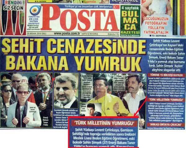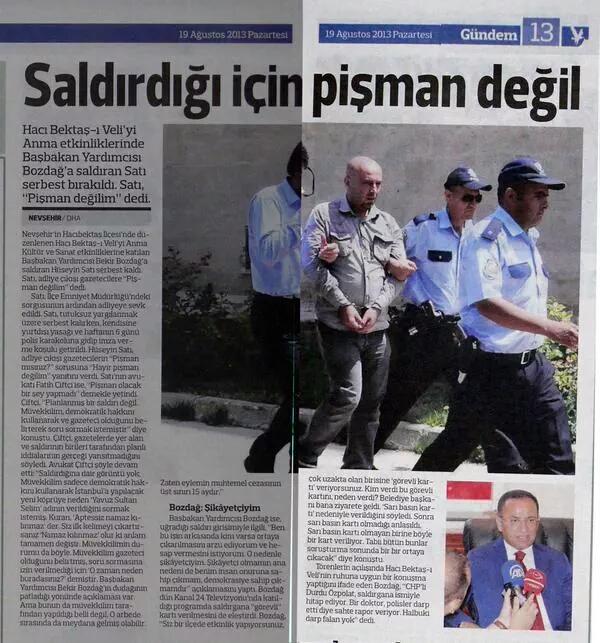 Hürriyet gazetesi, şiddete karşı iğrenç ve destekleyici tutumunu, dönemin Başbakan Yardımcısı Bekir Bozdağ’ın 16 Ağustos 2013’te Hacı Bektaş-ı Veli anma törenlerinde bir kişinin yumruklu saldırısına uğramasında da gösterdi. Devletin bakanını yumruklayan saldırganın, “Pişman değilim” şeklindeki açıklamasını sayfa manşetine taşıyarak şiddeti meşrulaştırmaya çalıştı. Hürriyet’in bu çirkin tutumu, dönemin Enerji Bakanı Taner Yıldız şiddete maruz kaldığında da devam etti. Taner Yıldız’a saldıran şahıs serbest bırakıldığında bugünkü gibi, “Bu saldırgan neden serbest kaldı” itirazını yapmadı.