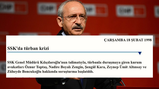 Kılıçdaroğlu bugün “Uzun bir süre sizin başörtünüzle de uğraştılar. Erkekler uğraştı. Size ne ya size ne” diye açıklama yaptı, oysa 1998 yılında SGK’da başörtülü diye davalara giren avukatlar hakkında soruşturma başlatan bizzat kendisiydi.
