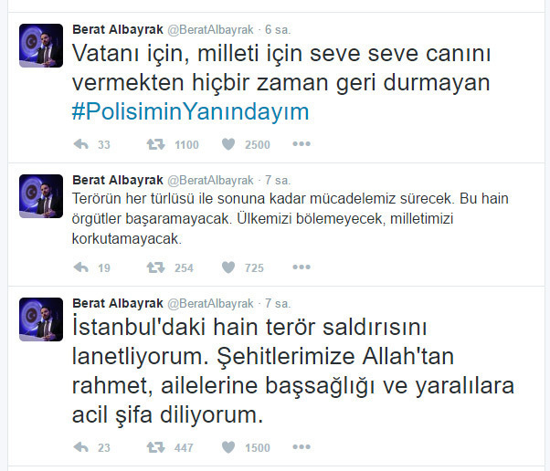 Enerji ve Tabii Kaynaklar Bakanı Berat Albayrak, İstanbul Beşiktaş’ta gerçekleştiren terör saldırısı ile ilgili olarak, “Bu hain örgütler başaramayacak. Ülkemizi bölemeyecek, milletimizi korkutamayacak. İstanbul’daki hain terör saldırısını lanetliyorum. Şehitlerimize Allah’tan rahmet, ailelerine başsağlığı ve yaralılara acil şifa diliyorum” dedi.