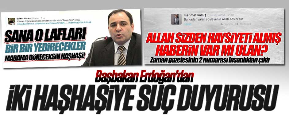 Başbakan Recep Tayyip Erdoğan, attıkları twitlerle kendisine hakaret ettikleri iddiasıyla Today’s Zaman Genel Yayın Yönetmeni Bülent Keneş ile Zaman gazetesi yazarı Mehmet Kamış hakkında suç duyurusunda bulundu.
