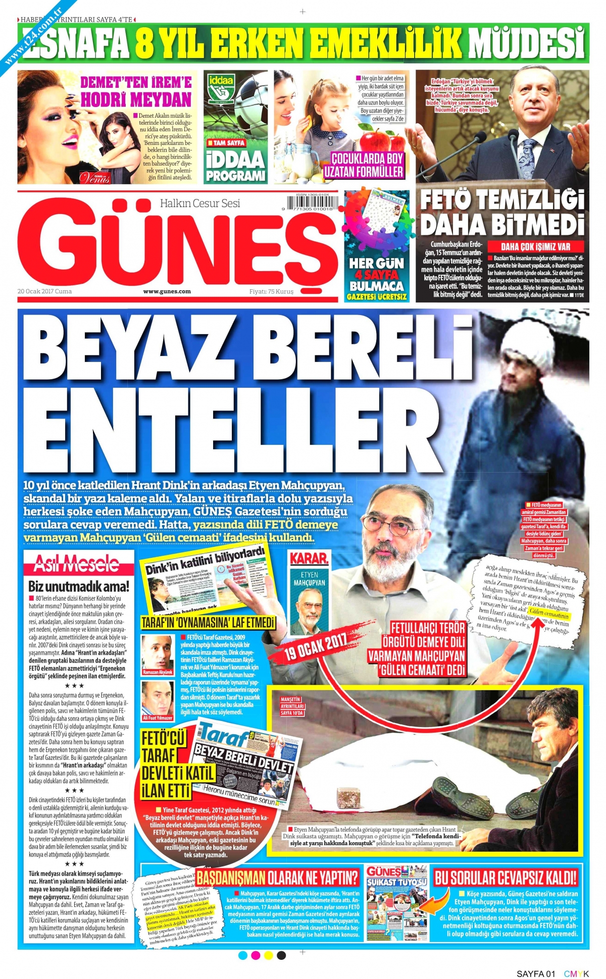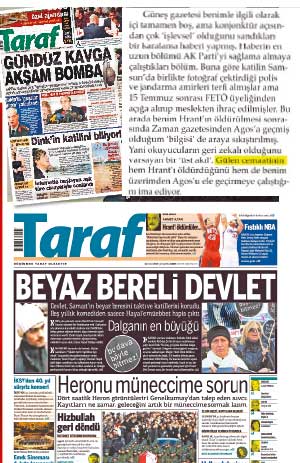 FETÖ’nün tetikçi gazetesi Taraf, Dink cinayetinin 5. yıldönümünde büyük bir skandala daha imza atmıştı. Gazete, 2012 yılında attığı “Beyaz bereli devlet” manşetiyle açıkça Hrant’ın katilinin devlet olduğunu iddia etmişti. Böylece, cinayeti işlediği artık gün gibi ortada olan FETÖ’yü yine gizlemeye çalışmıştı. Ancak Dink’in arkadaşı Mahçupyan, eski gazetesinin bu rezilliğine ilişkin de bugüne kadar tek satır yazmadı.