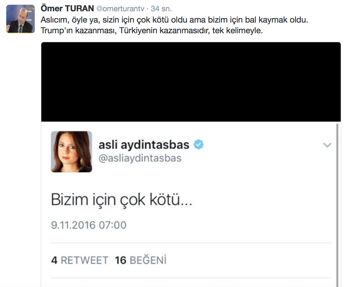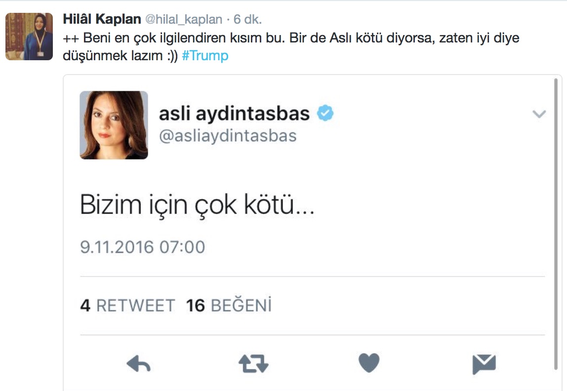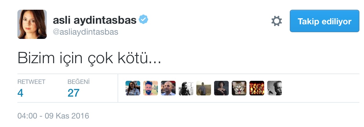 FETÖ-PKK paçavrası Cumhuriyet’te yazan, Obama’nın yardımcısı Joe Biden’ın “gülü”, FETÖ ve PKK destekçisi Aslı Aydıntaşbaş, ABD başkanlık seçiminden Donald Trump’ın zaferle çıkacak olmasına “bizim için çok kötü” yorumu yaptı. Tabi herkes Aslı’nın “biz” derken Türk milletini kastetmediğini şıp diye anladı. Onun “biz” dediği PKK, FETÖ gibi Clinton’a yatırım yapan uşaklardı.