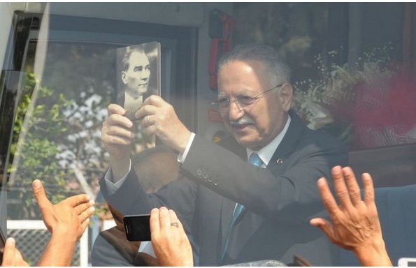 Burada bir vatandaş kendisine Atatürk’ü anlatan bir kitap hediye etti. Kitabı kalabalığa gösteren İhsanoğlu, kitabı öpüp başına götürdü.