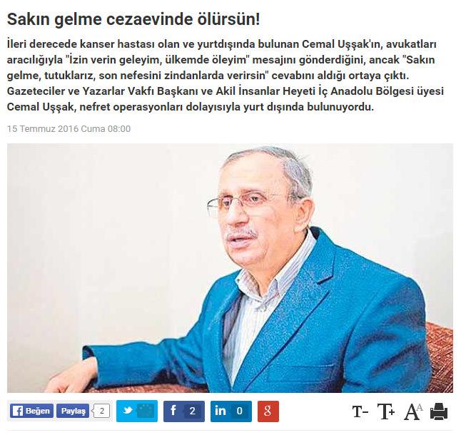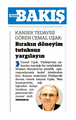 FETÖ/PDY’ye yönelik çatı soruşturması kapsamında hakkında gözaltı ve yakalama kararı çıkarılınca yurt dışına kaçan ve tüm aramalara rağmen bu güne kadar ele geçirilemeyen Cemal Uşşak’ın soruşturma savcısına “Kanser hastasıyım. Dönüp ülkemde öleyim.” başvurusu yaptığı paralel yapıya yakın yayın organlarınca dile getirildi. Soruşturma savcısının ise “Dönersen tutuklarız” dediği öne sürüldü.