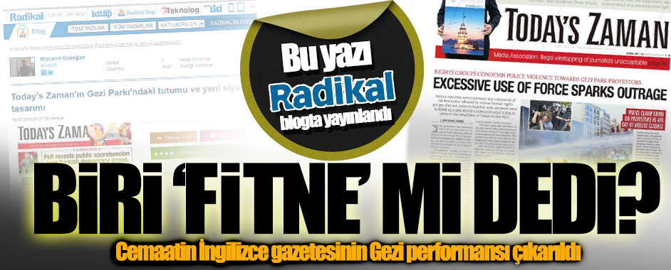 MEDYAGÜNDEM- Radikal gazetesinijn blog sayfalarında yayınlanan Mücahit Özdoğan imzalı bir yazıda, cemaatin İngilizce gazetesi Today’s Zaman’ın Gezi Parkı olayları sürecindeki tutumu masaya yatırılıp örneklerle çarpıcı bir analiz ortaya kondu.