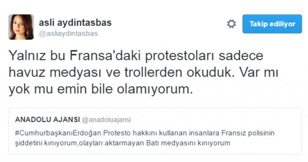 Yaşadığı ülkeye olan nefretini twitter’da kusan gazeteci(!) Aydıntaşbaş, Fransa’da polis şiddetine delil olacak nitelikteki onlarca videoyu ve fotoğrafı görmezden gelerek “Olaylar var mı yok mu emin bile olamıyorum” dedi.