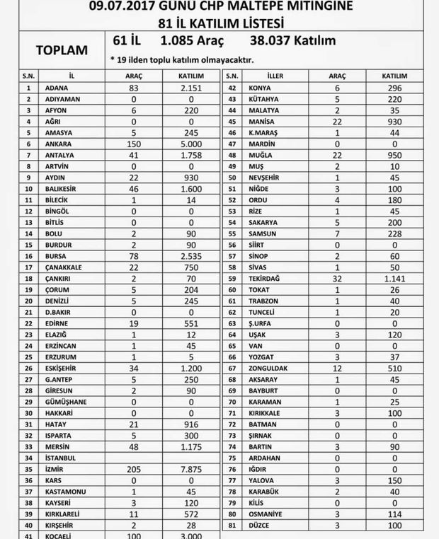 Kemal Kılıçdaroğlu’nun gerçekleştirdiği sözde adalet mitingi için CHP il ve ilçe teşkilatları otobüslerle Maltepe’ye sefer düzenledi. Emniyet 175 bin kişinin mitinde katıldığını açıkladı. CHP’nin mitingine 81 ilden katılım listesi de ortaya çıktı. 61 ilden toplu katılım gerçekleşirken 19 ilden ise mitinge destek verilmedi. 61 ilden bin 85 araç ile 38 bin 37 kişi katıldı. İşte katılım sayısını gösteren o belge…