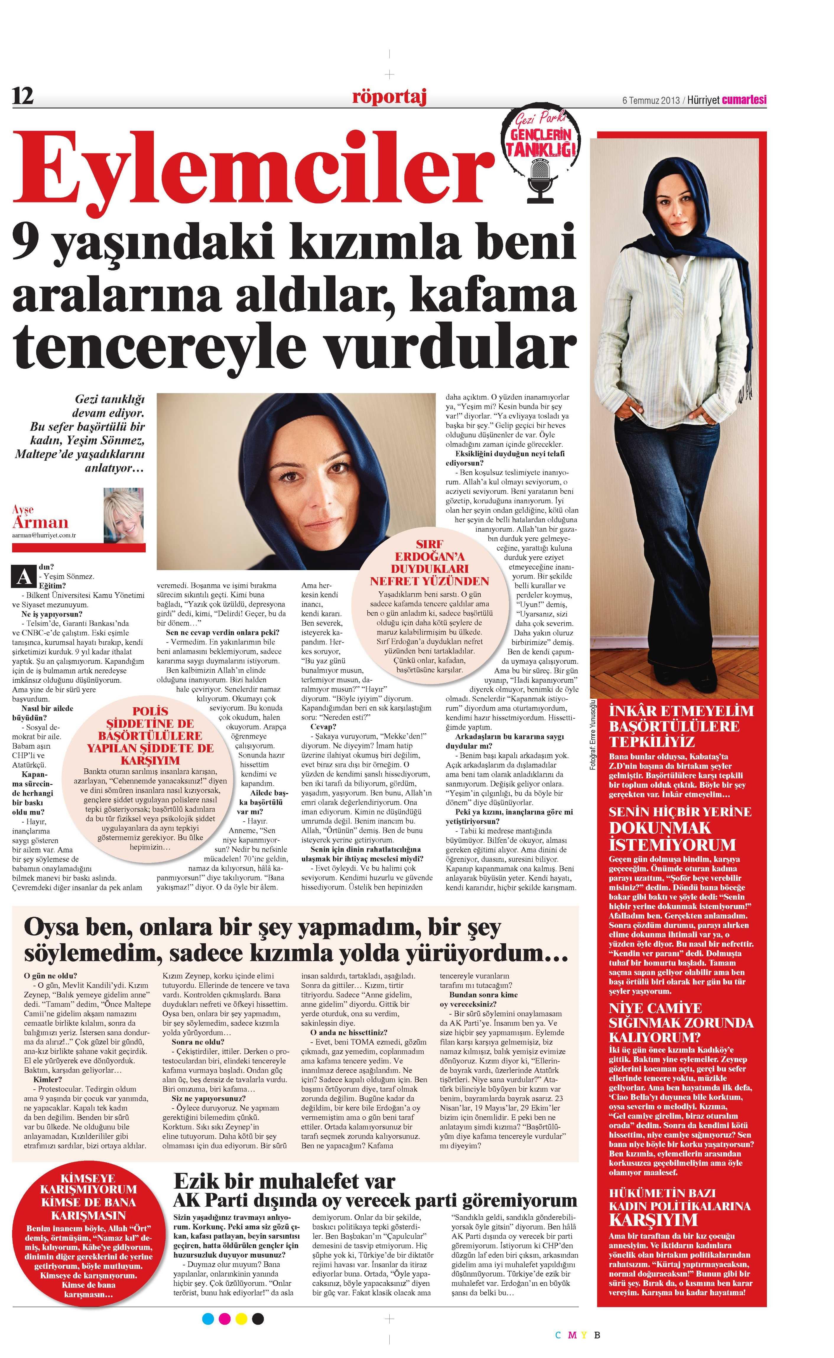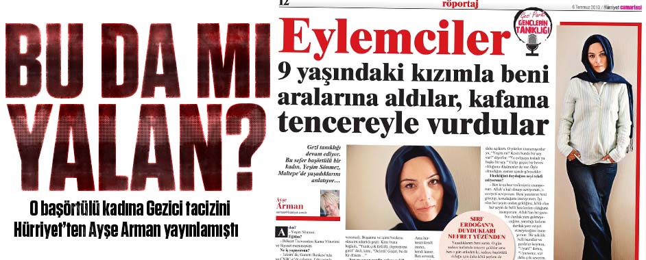 Hürriyet yazarları Kabataş’taki çirkin taciz olayını sulandırmaya çalışırken Ayşe Arman’ın 2013 yılında 9 yaşındaki bir çocuğu ile birlikte Maltepe’de Gezi eylemcilerinin saldırısına uğrayan başörtülü kadının tam sayfa röportajını yayınladığı ortaya çıktı. 9 yaşında kızı ile birlikte çekiştirilen, itilen, kafasına tencerelerle vurulan kadın Gezi Vandallarının elinden zorla kurtulduktan sonra Ayşe Arman’a konuşuyor. Hürriyet Gazetesi’nde yayınlanan röportajda aynen şu ifadelere yer veriliyor: “Bunlar bana olduysa, Kabataş’ta ZD’nin başına bir şeyler gelmiştir. Başörtülülere tepkili bir toplum olduk. Böyle bir şey gerçekten var. İnkar etmeyelim.”