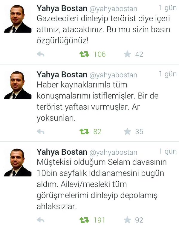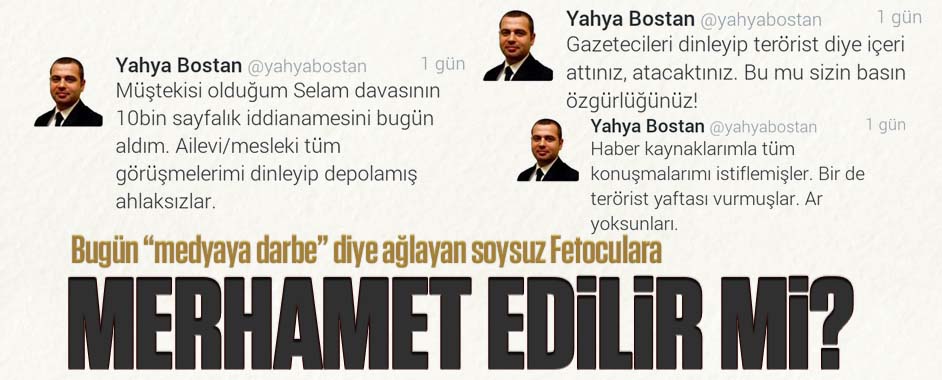 Bugün “medyaya kanlı darbe” diye ağlıyorlar. Ama dün gazetecileri türlü kumpaslar kelepçelerken, gazetelere baskın düzenlerken “yargı hür” manşetiyle despotluğu savunuyorlardı. Paralel örgüt amacına ulaşabilseydi Tevhid Selam Kudüs Ordusu terör örgütü soruşturması kapsamında tam 242 kişiyi gözaltına alacaktı. Uydurdukları “Selam Tevhid” isimli örgütle ne kadar kendilerine muhalif gördükleri isim varsa dinlediler, izlediler, Türkiye’yi açık hava hapishanesine çevirecek operasyonlara hazırlandılar. Ama başaramadılar. Bugünse ağlıyorlar. FETÖ’nün “Selam Tevhid” kumpasının mağdurlarından Sabah gazetesi Ankara haber müdürü Yahya Bostan’ın şu tweetleri Fetoculara asla merhamet edilmemesi gerektiğinin göstergesi: