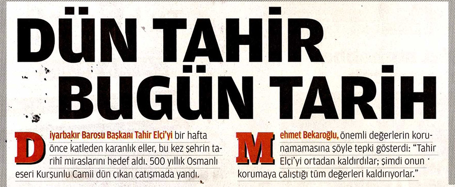 MEDYAGUNDEM.COM- Düşünün Müslüman olduklarını iddia eden Fetocular, Diyarbakır’da 5 asırlık tarihi camiyi yakan ve İslam’a savaş açan terör örgütü PKK’yı savunuyor. Hem de yaktığı cami üzerinden… İşte bugünkü Zaman gazetesi… “Dün Tahir bugün tarih” manşetini atan Zaman gazetesi, Diyarbakır’daki Kurşunlu Camii’ni PKK’nın yaktığı gerçeği apaçık ortada olmasına rağmen, “karanlık eller yaptı” diyerek PKK medyası ile ortak bir dil kullanıp devleti suçladı.