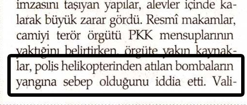 Cami yakıp asıl savaşını İslam’a açan PKK’yı savunmak sözde Müslüman olduğunu iddia eden Fetocu Zaman’a kalmış olmalı ki, PKK medyasının yalanlarına haberde yer verildi. Zaman, “…örgüte yakın kaynaklar polis helikopterinden atılan bombaların yangına sebep olduğunu iddia etti.” diyerek bir terör örgütünün alçakça yalanına sarıldı.