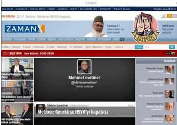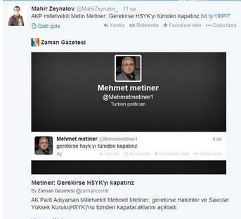 Zaman gazetesi web sitesi AK parti Milletvekili Mehmet Metiner’le ilgili açılan sahte bir hesaptan atılan tweeti haberleştirip manşetine taşıdı. Zaman, Metiner’le ilgili fake (sahte) hesaptan atılan “Gerekirse HSYK’yı tümden kapatırız” tweetini hiç sorgulamadan alarak manşetine taşıdı. 17 Aralık’tan bu yana yazdığı yazılar ve attığı tweetlerle kara propagandaya katkı sunan Today’s Zaman yazarı Mahir Zeylanov ise bu haberi sosyal medyada paylaştı.