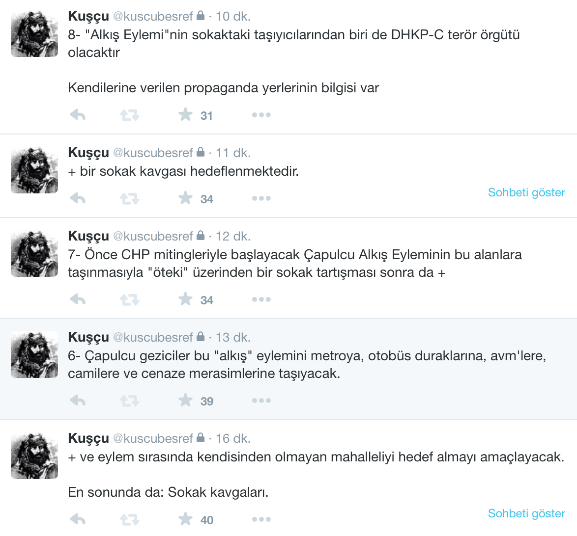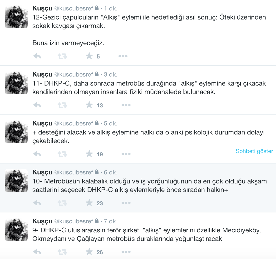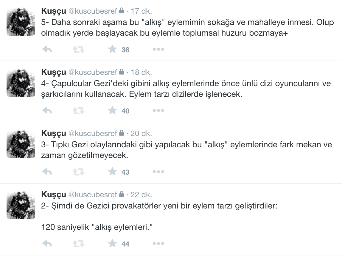 Sosyal medyanın fenomen hesaplarından biri olan “Kuşçubaşı Eşref” Gezici çapulcuların DHKP-C terör örgütü eliyle yeni kaos planlarını deşifre etti. Gezi kalkışmasında “tencere-tava” eylemlerinin yerini şimdi alkışların alacağını açıklayan Kuşçubaşı Eşref, eylemlerin nasıl yapılacağını da adım adım anlattı. Çapulcuların alkış eylemi CHP’nin “Milletçe alkışlıyoruz” reklam filmini de akla getirdi. CHP’nin de bu yeni kaos planındaki rolü ve DHKP-C terör örgütüyle ilişkisi sorgulanmayı gerekli kıldı. İşte Kuşçubaşı Eşref’in iddiaları: