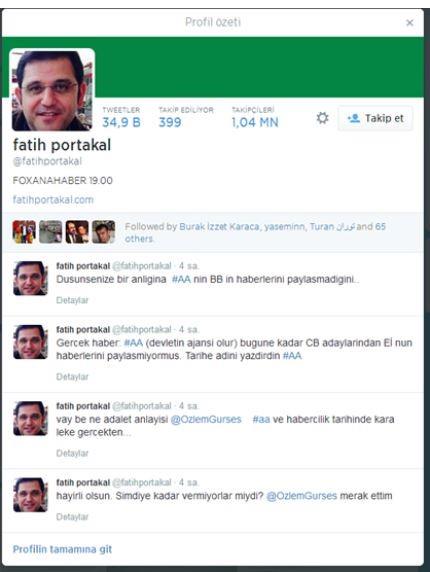 Gazeteci Patih Portakal’da bilginin gerçek olup olmadığını Özlem Gürses’e Twitter’dan sordu. Gürses daha önce takip edilmediklerini savundu. Portakal “vay be ne adalet anlayisi @OzlemGurses #aa ve habercilik tarihinde kara leke gercekten…” diyerek kurum alehinde mesajlar paylaştı.