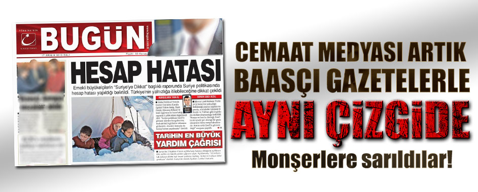 Gülen grubuna yakınlığıyla bilinen Bugün, emekli monşerler üzerinden hükümetin Aydınlık, Yurt, Cumhuriyet ve Sözcü gibi Baasçı gazetelerle aynı çizgide davranıp Suriye politikasını eleştirdi.